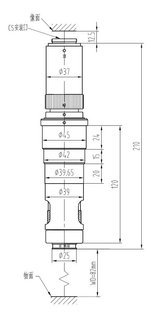 安裝尺寸:Φ45mm 最大兼容相機(jī):1/2" CCD螺紋接口:1英吋32扣